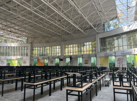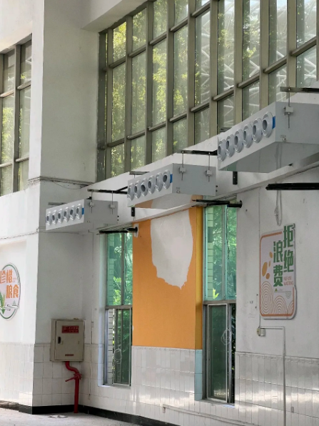 项目挑战• 高温+高密度:几百名学生同时就餐,人体散热+厨房热量让室温快速上升。• 超高层高:12米层高意味着冷气容易滞留在顶部,地面温度依然闷热,形成“头冷脚热”的不适感。• 油烟环境:学校食堂空气中含有油烟与水汽,容易影响空调换热效率与使用寿命。