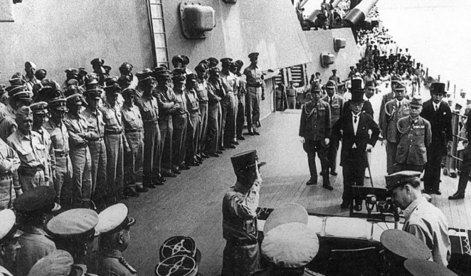 1945年9月2日,在密苏里号军舰上,日本正式签署无条件投降书,中国人民抗日战争暨世界反法西斯战争宣告胜利结束。