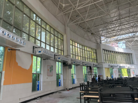 项目挑战• 高温+高密度:几百名学生同时就餐,人体散热+厨房热量让室温快速上升。• 超高层高:12米层高意味着冷气容易滞留在顶部,地面温度依然闷热,形成“头冷脚热”的不适感。• 油烟环境:学校食堂空气中含有油烟与水汽,容易影响空调换热效率与使用寿命。